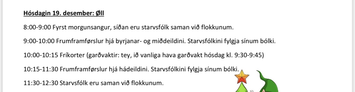 Møtið kl. 08 í skúlanum. Dagurin er liðugur kl. 10.